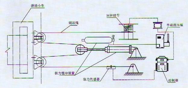 本裝置主要由基座、張緊絞車、液壓張力緩沖裝置、控制箱和張力傳感器五部分組成。圖示中的鋼絲繩由用戶提供,游動小車是皮帶機部件。張緊動作可根據需要實現變頻控制。 該型號張緊裝置結構簡單、經濟可靠、為免維護型張緊裝置。可用在采煤工作面。